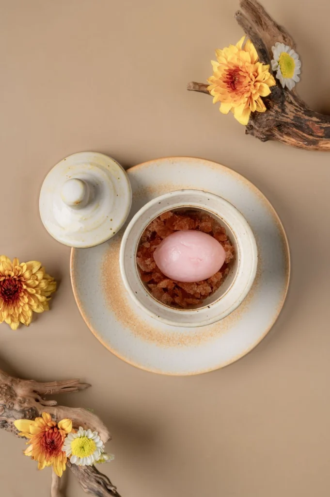 Hokkaido Scallop marinated in Kizame wasabi, passion fruit & coconut cheesecake , myoga