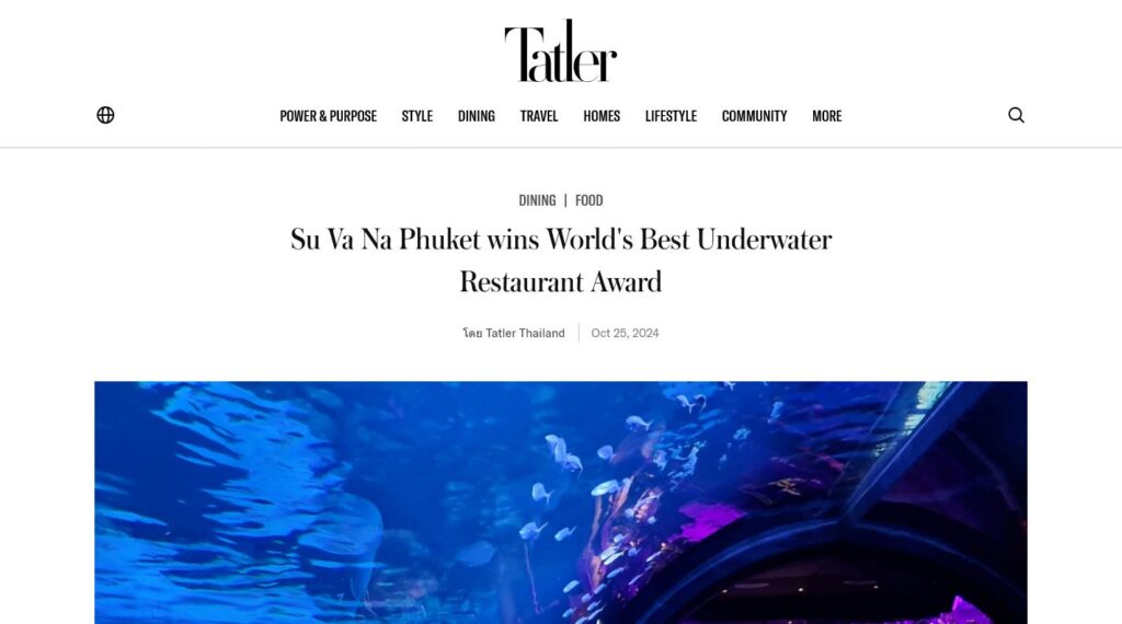 Tatler Asia announces Su Va Na Phuket as the winner of a major international award, highlighting its immersive aquarium setting,