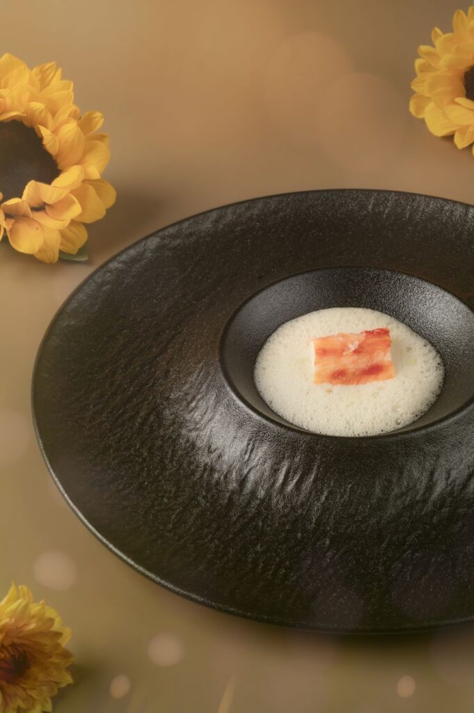 Hokkaido Scallop marinated in Kizame wasabi, passion fruit & coconut cheesecake, myoga