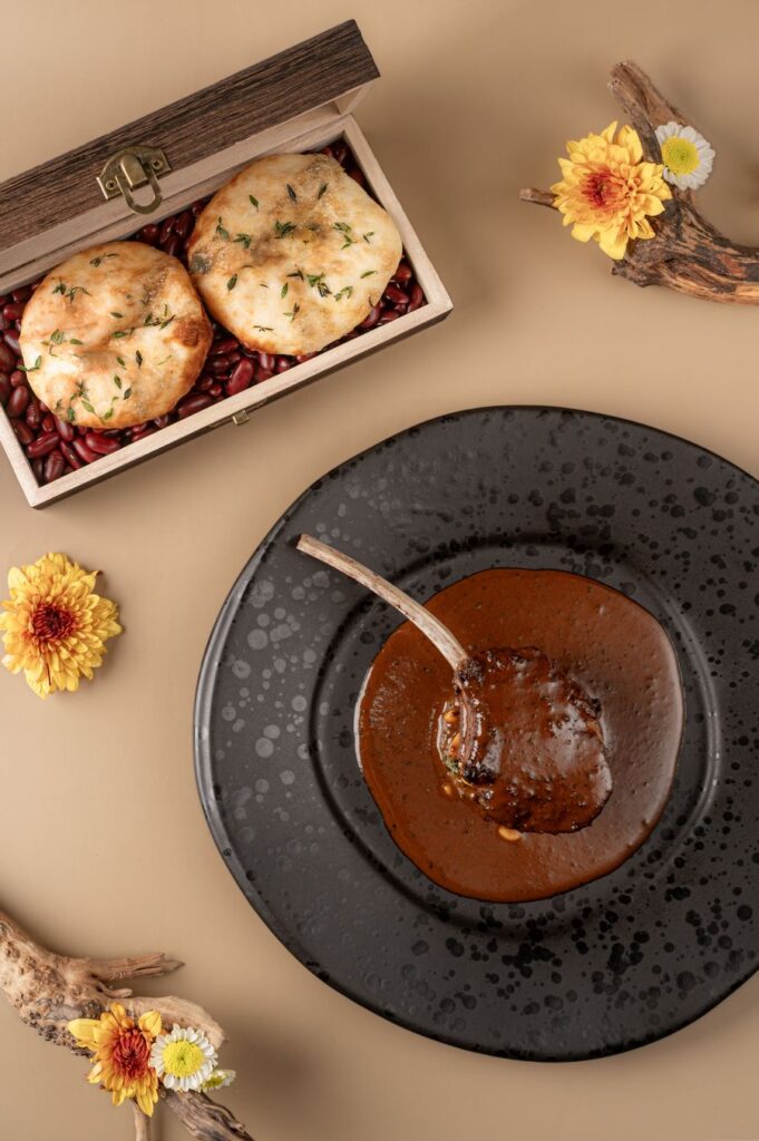 Paired with a deep rich sauce inspired by Mexican mole with an essence of Thai Massaman, Asian mustard dates pine nuts and fresh grapes.